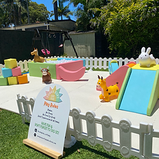 Your SunnyBubs Party Package Includes: • Pyramid Stair & Slide • 1.5m x 1.5m Ball Pit • EVA Soft Mats • White Picket Fencing • Car • Moon Rocker • 2 x Hoppers Set Size: 6m x 4m total setup area** Let us know if you’d like to discuss customisation.